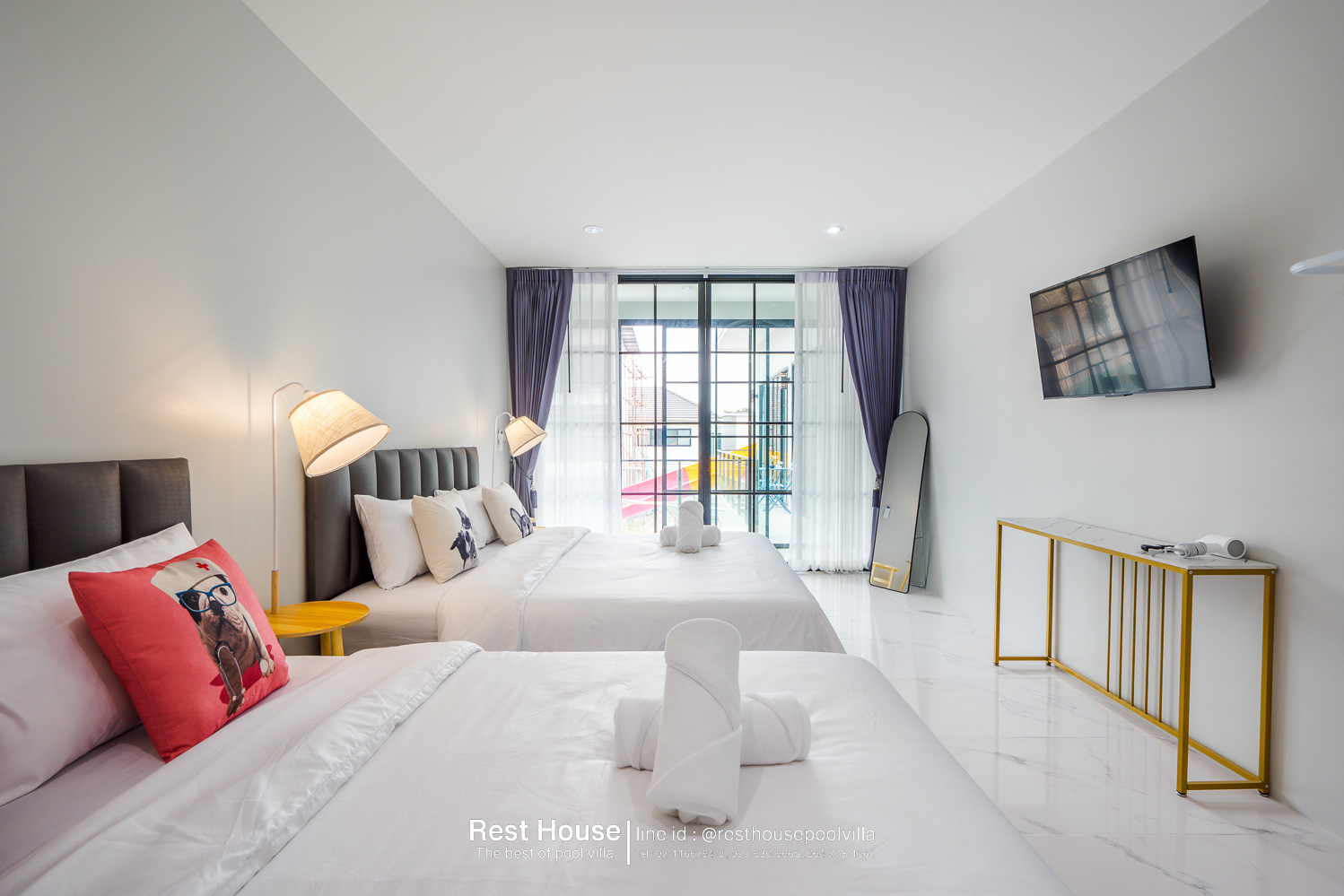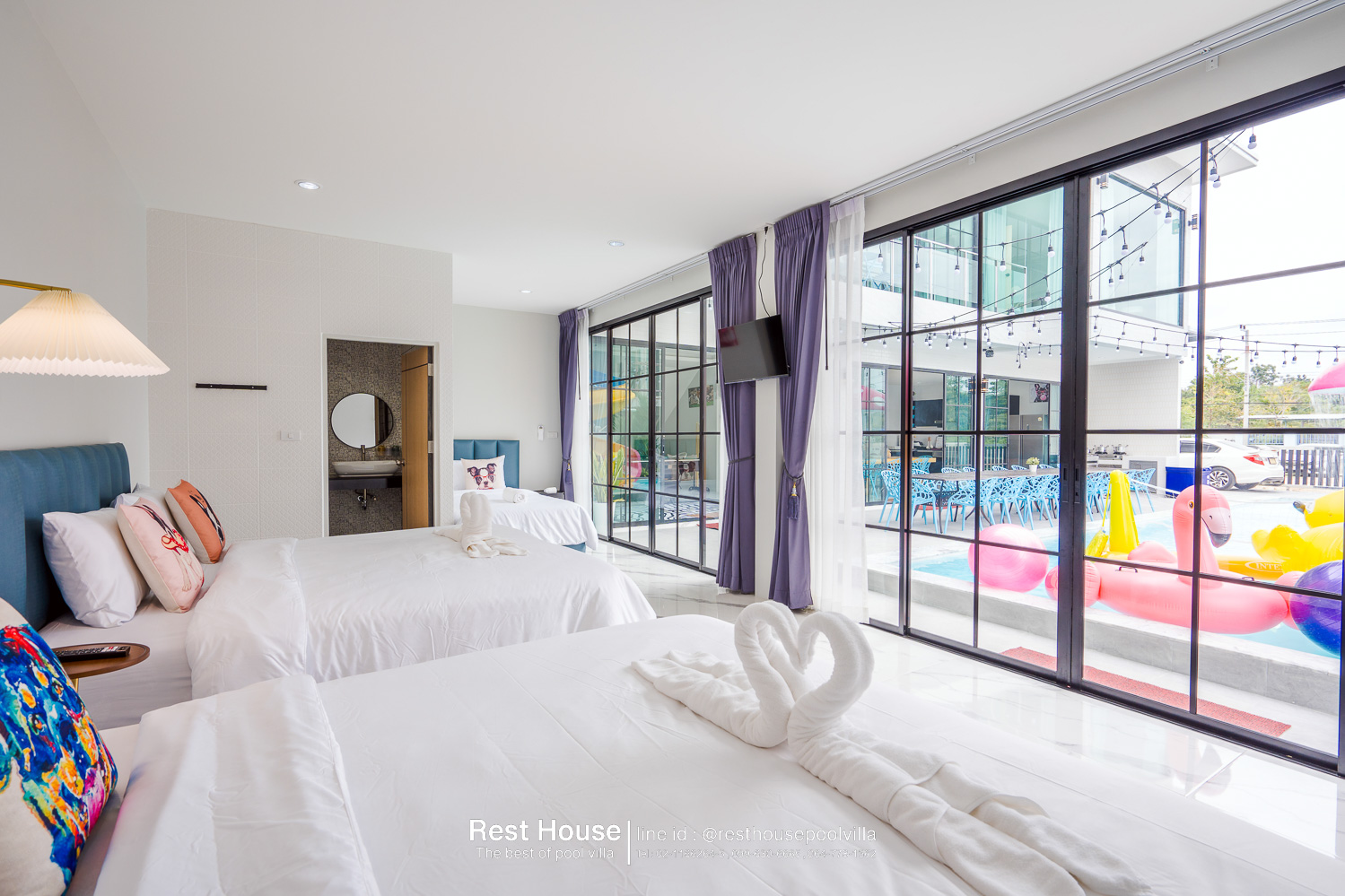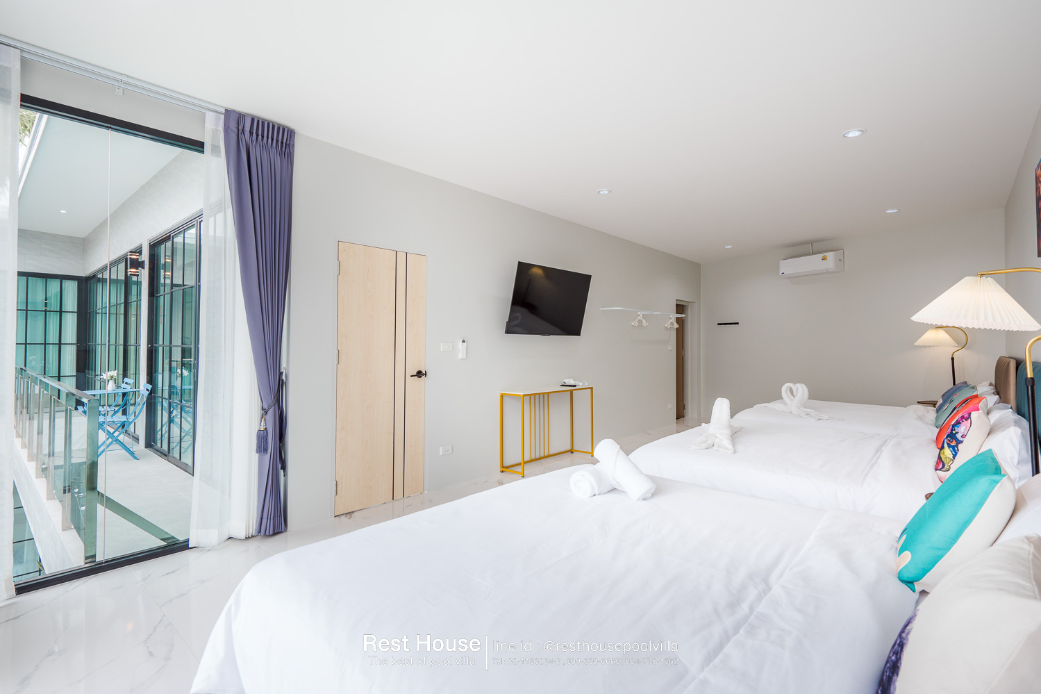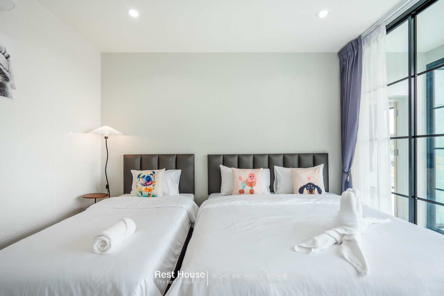 ห้องนอน 3 : ห้องริมสระ เตียง 6 ฟุต 2 เตียง + เตียง 3.5 ฟุต