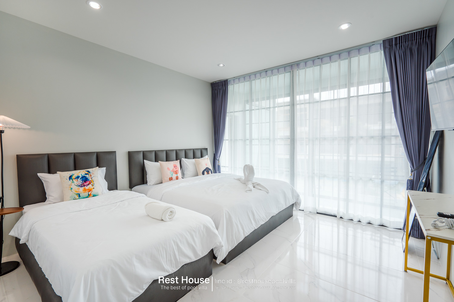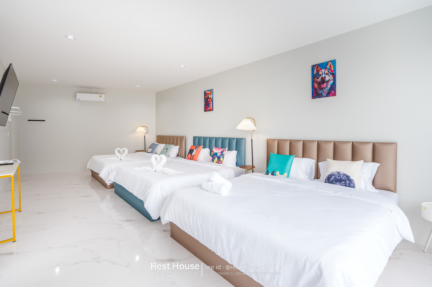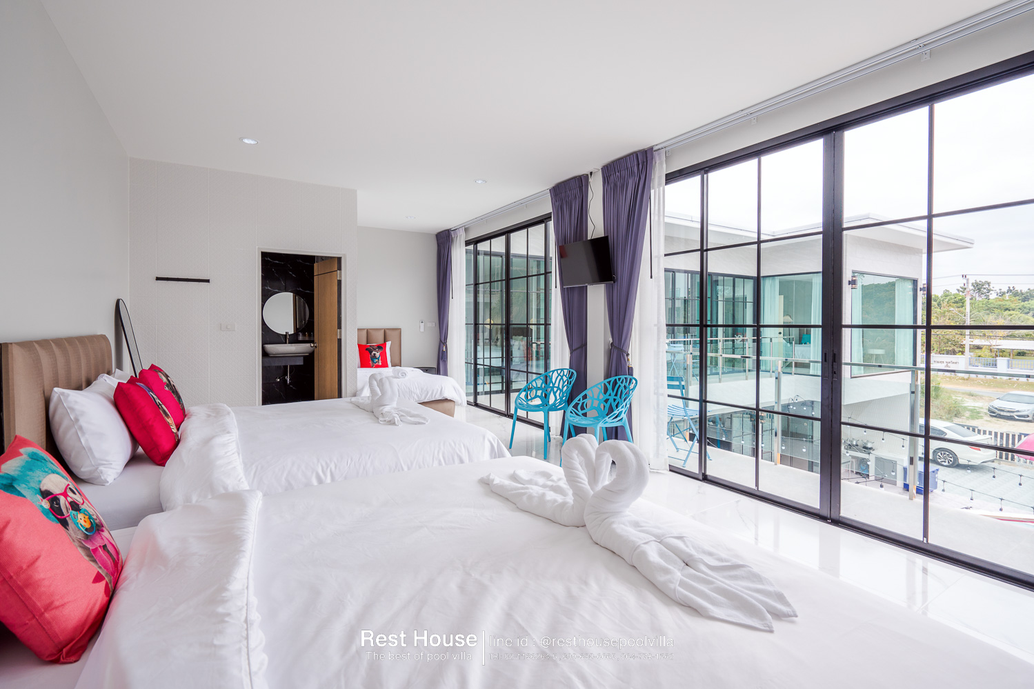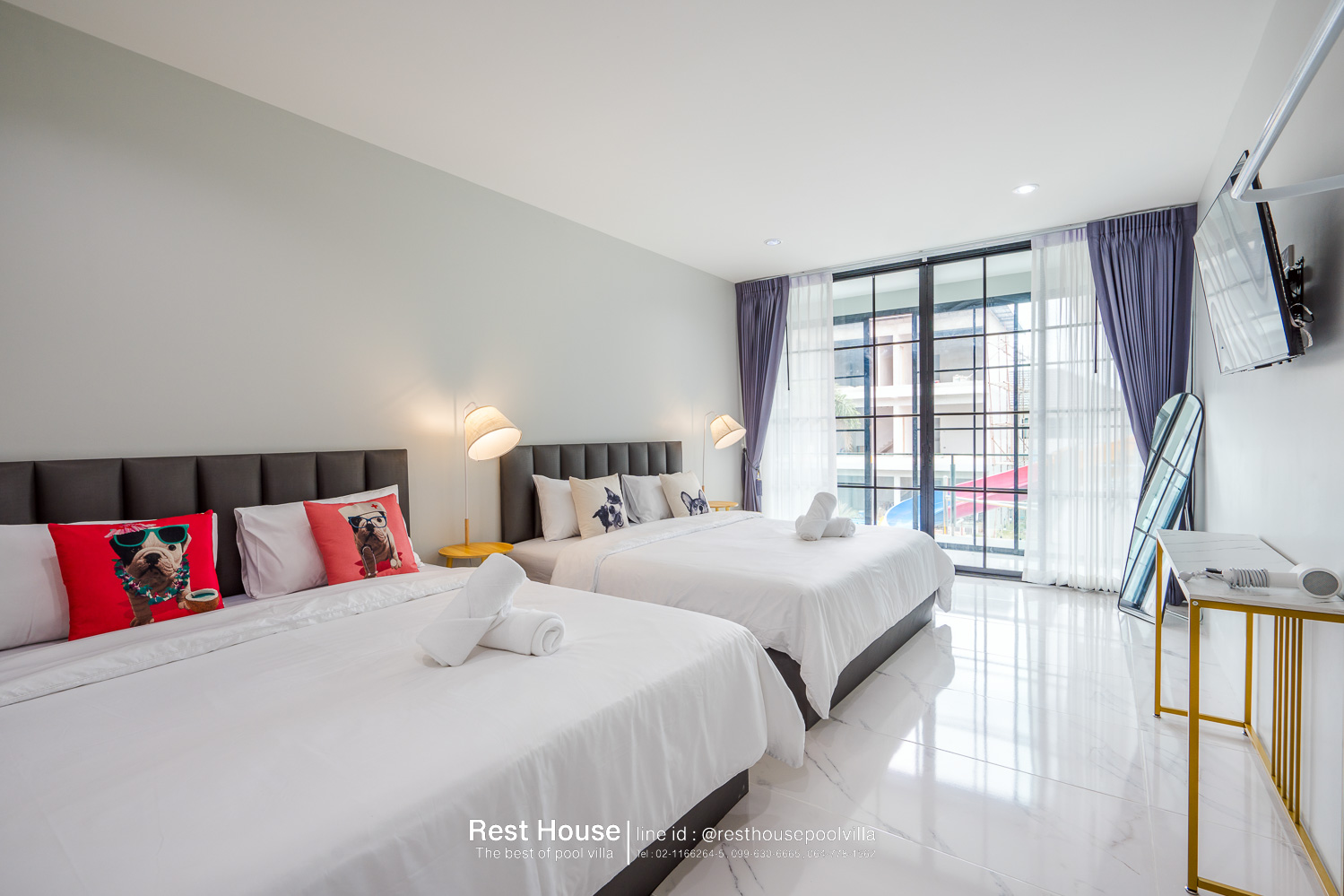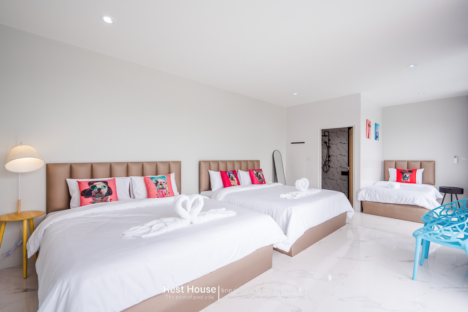 ห้องนอน 3 : ห้องริมสระ เตียง 6 ฟุต 2 เตียง + เตียง 3.5 ฟุต