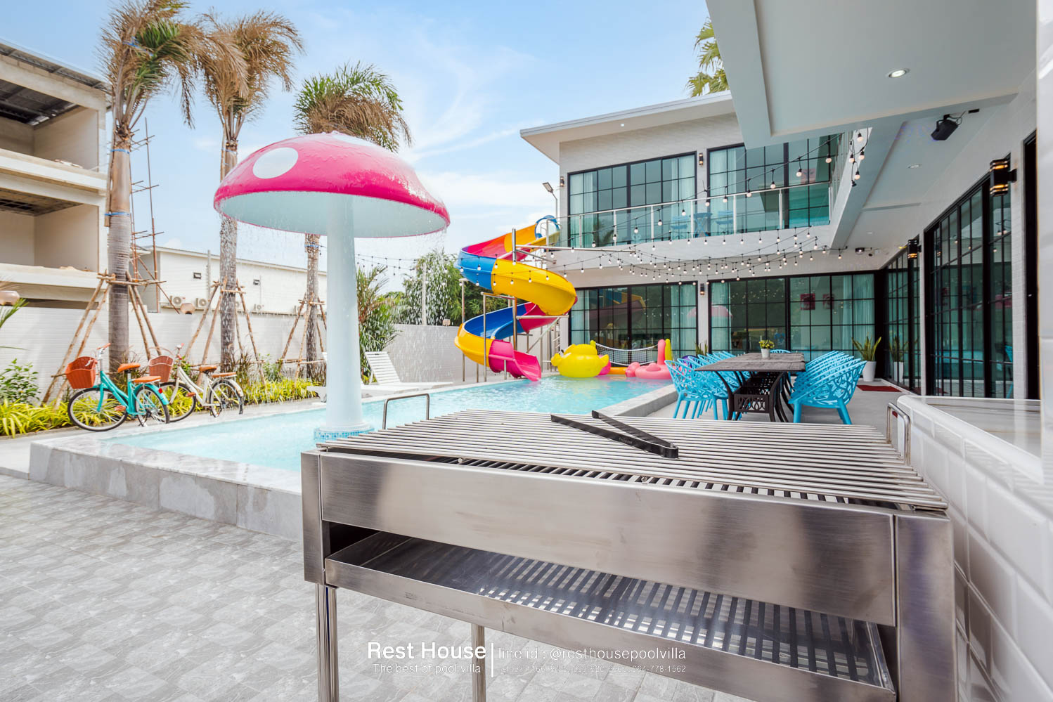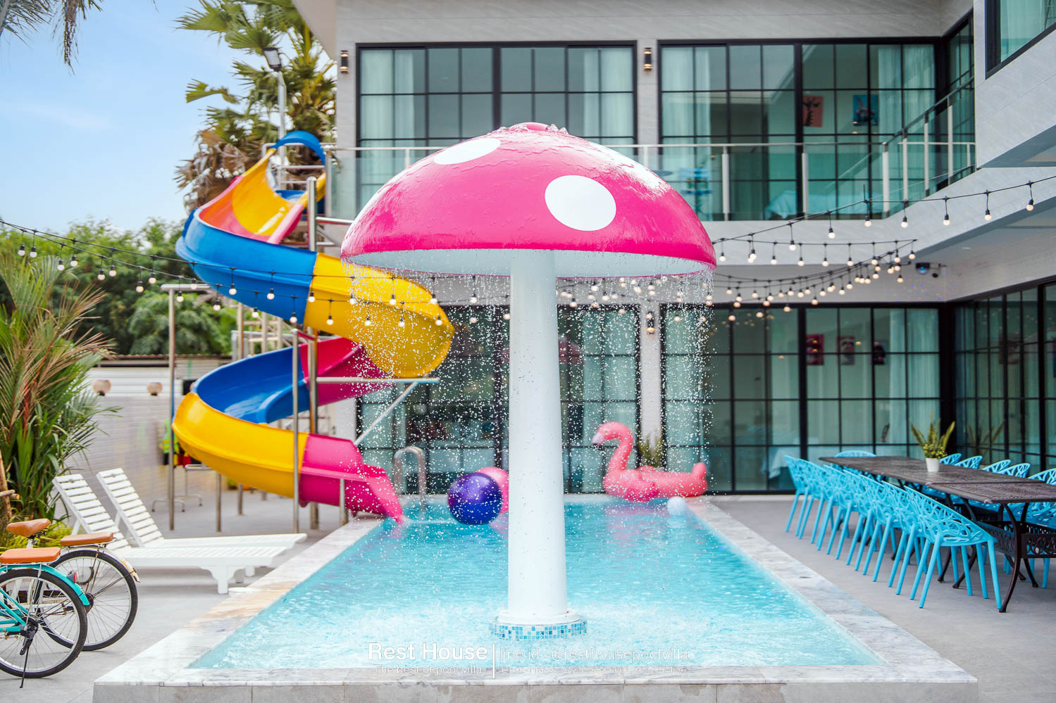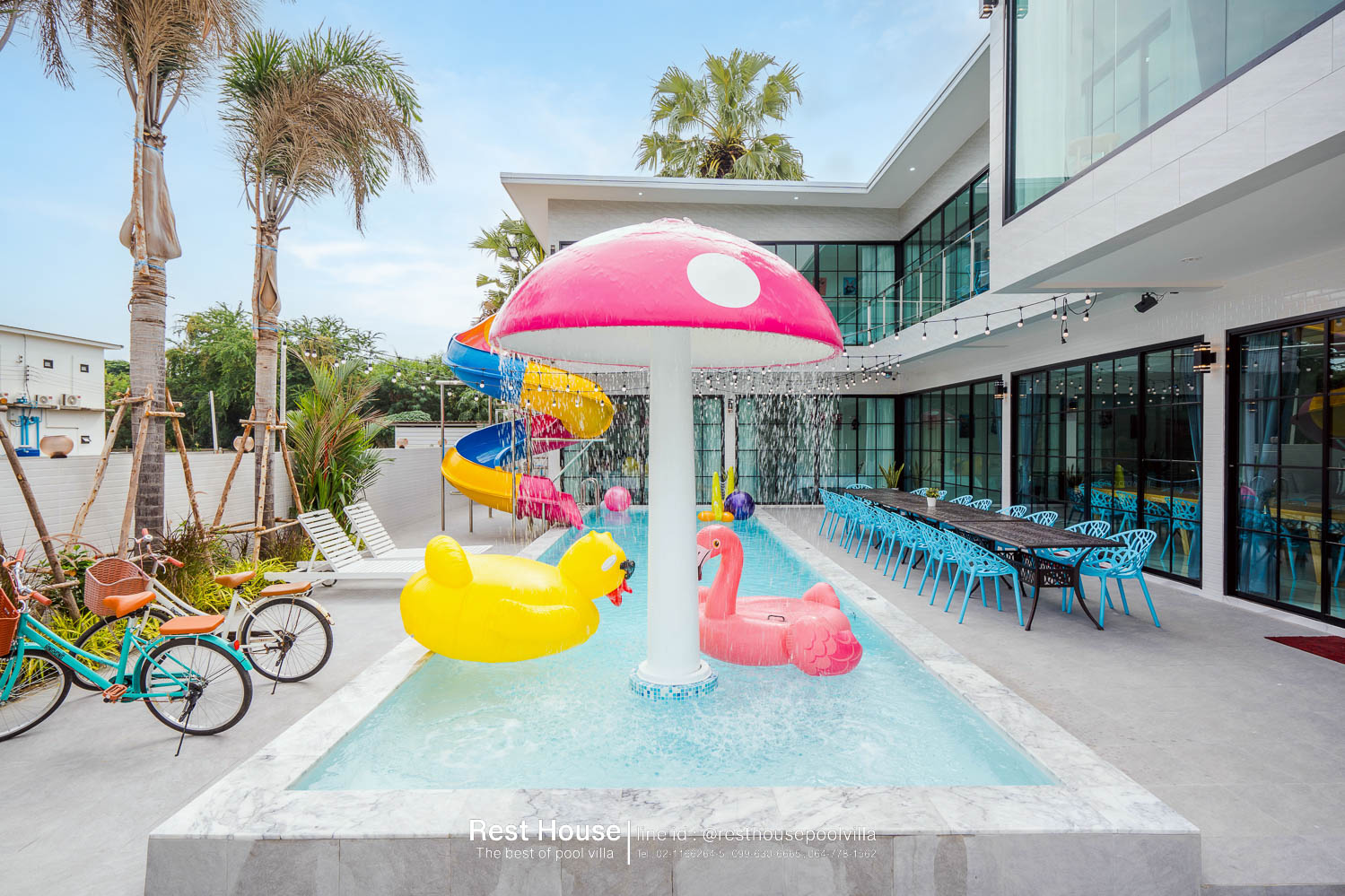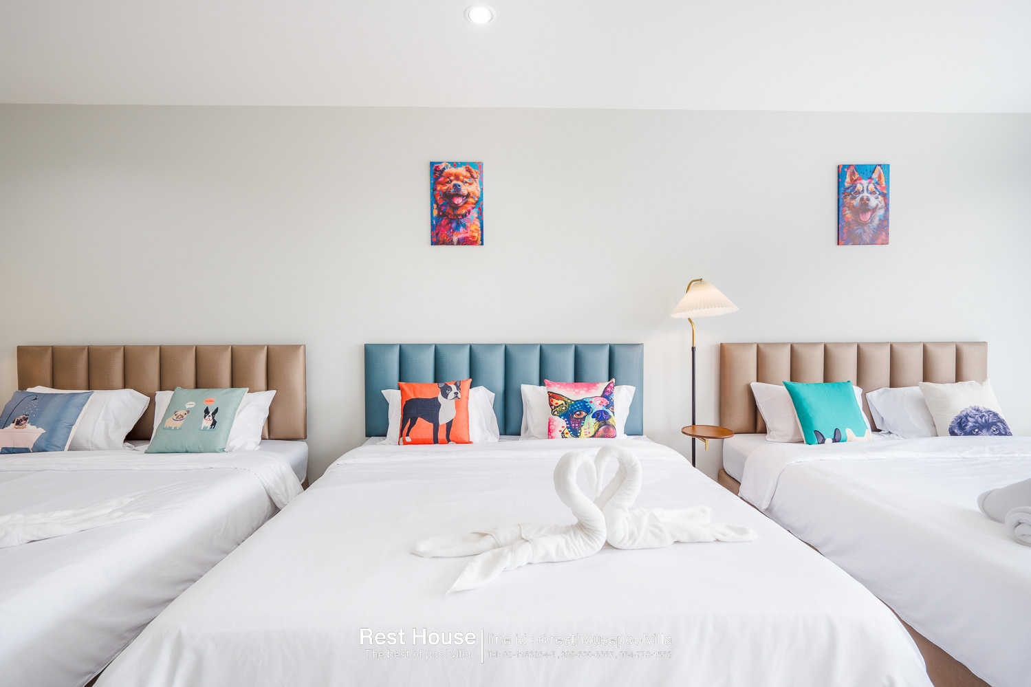 ห้องนอน 3 : ห้องริมสระ เตียง 6 ฟุต 2 เตียง + เตียง 3.5 ฟุต