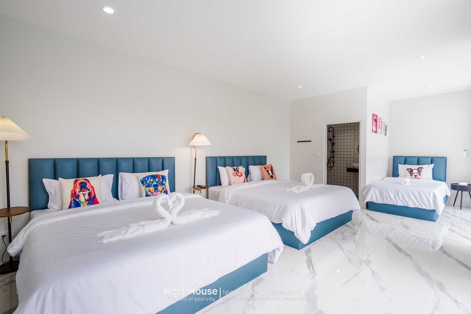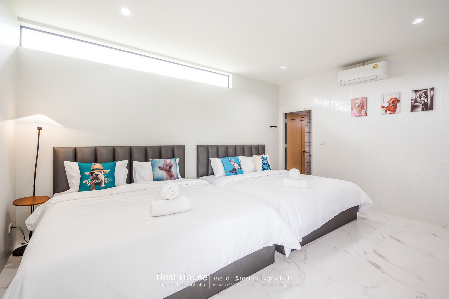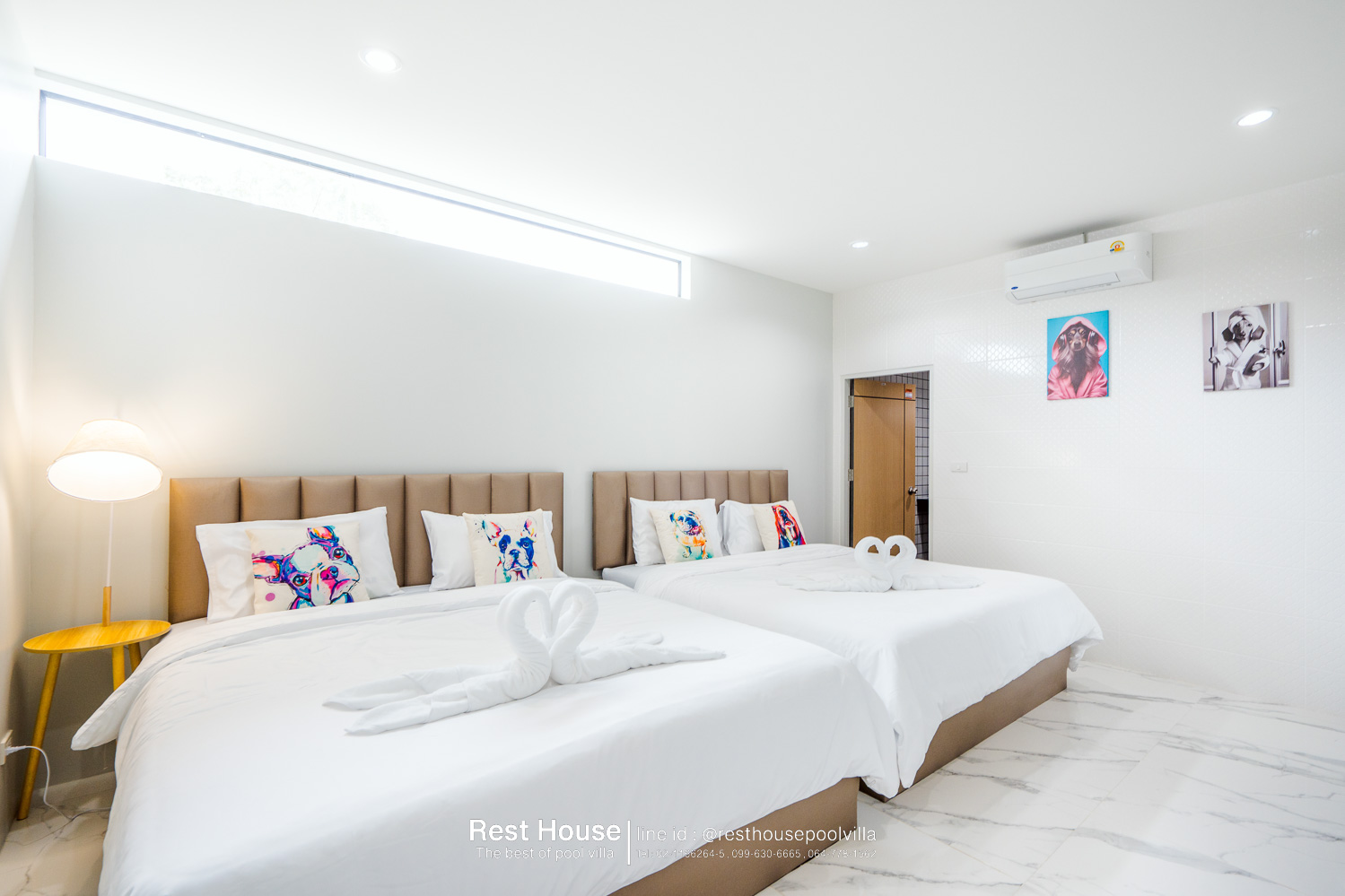 ห้องนอน 1 : ห้องริมสระ เตียง 6 ฟุต 2 เตียง + เตียง 3.5 ฟุต
