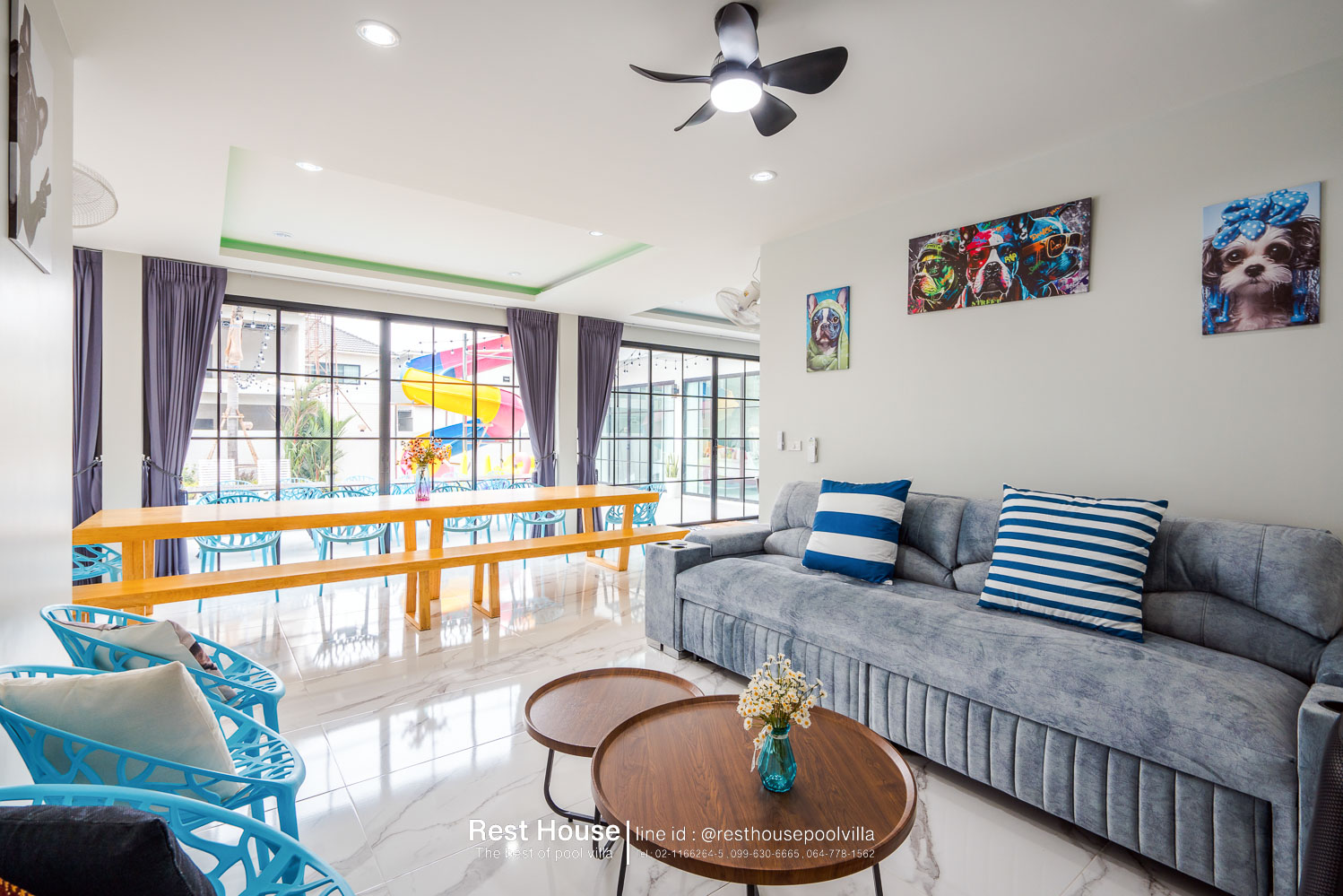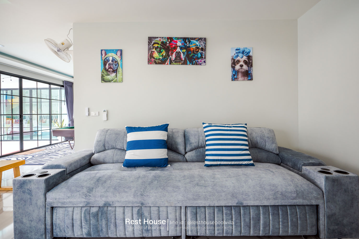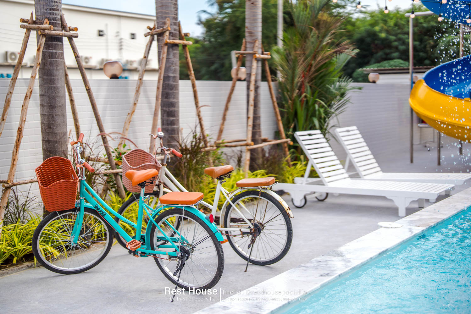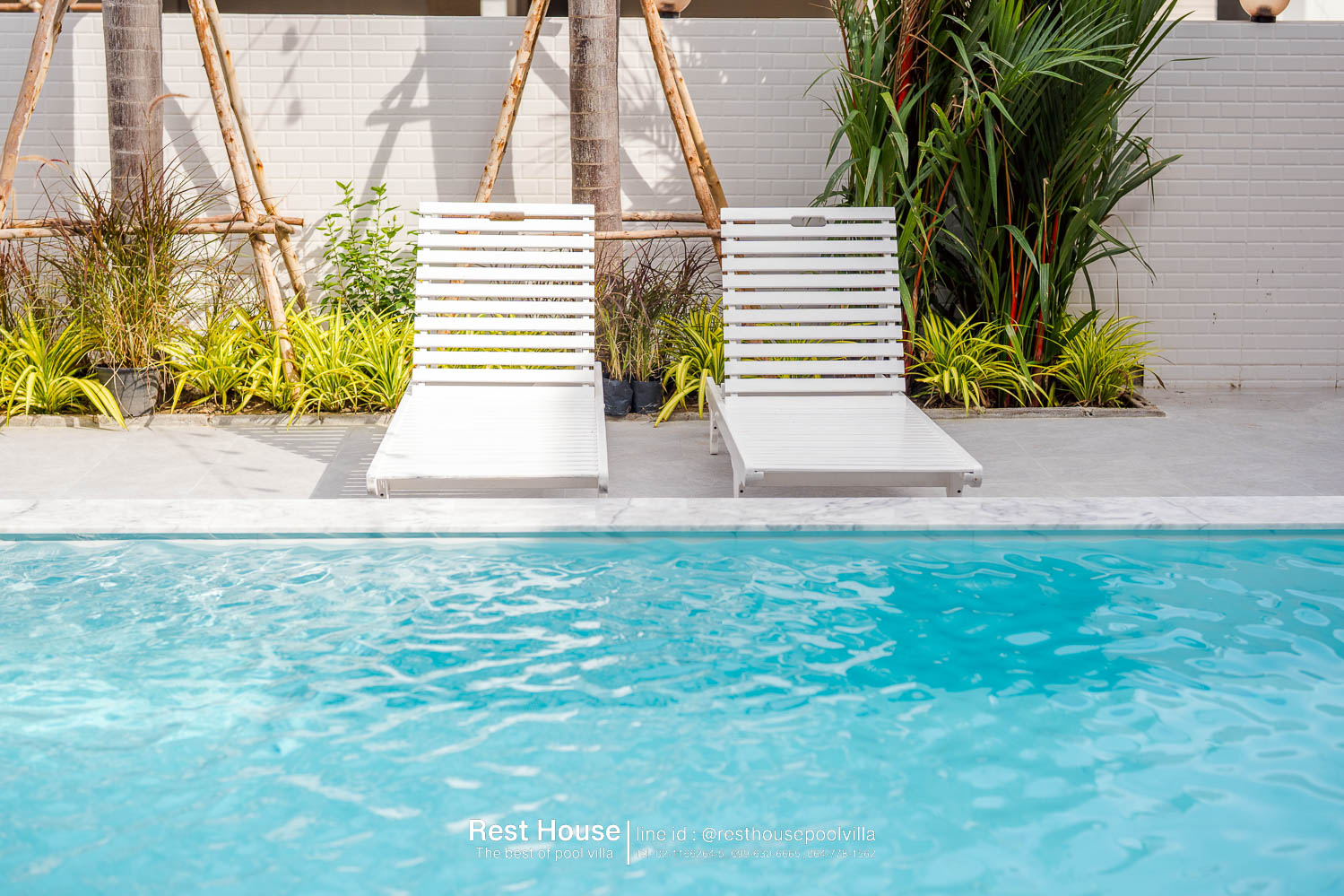 ห้องนอน 1 : ห้องริมสระ เตียง 6 ฟุต 2 เตียง + เตียง 3.5 ฟุต